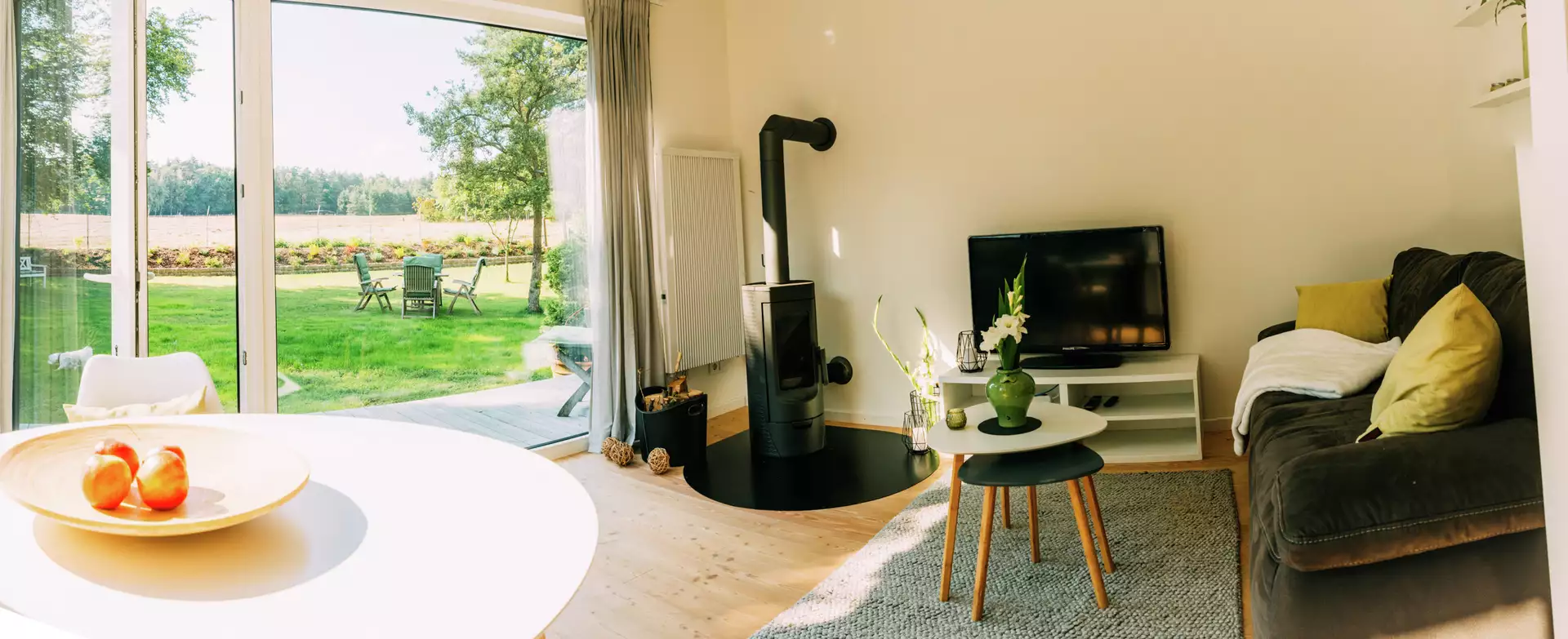 Das modern eingerichtete Ferienhaus für bis zu 4 Personen besticht durch seinen hyggeligen Charme und dem Weitblick über Feld und Wald. Die ca. 40 m2 umfassen ein großzügiges Schlafzimmer mit Doppelbett, Wohnraum mit offener, vollausgestatteter Küche und Schlafsofa (2 x1,50 m) und dänischem Kaminofen sowie Bad mit großer Dusche. Selbstverständlich mit freiem WLan und SmartTV.